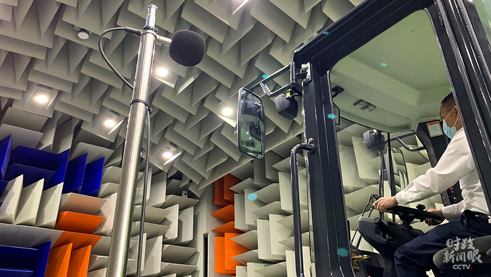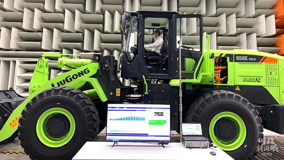 △研發(fā)中心的半消聲實(shí)驗(yàn)室正在為一款純電動(dòng)裝載機(jī)檢測(cè)噪聲數(shù)據(jù)。(總臺(tái)央視記者程鋮、張曉鵬拍攝)