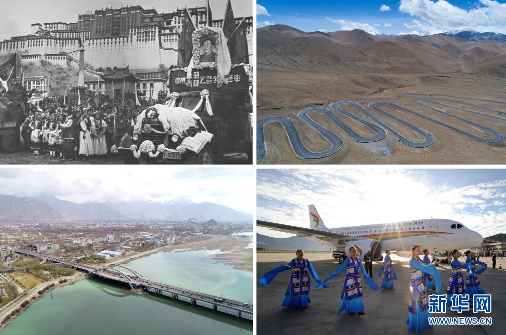 這是一張拼版照片:左上圖為1954年12月25日,康藏(今川藏)、青藏兩條公路通車儀式在布達(dá)拉宮前舉行(資料照片);左下圖為橫跨在拉薩河上的拉薩市區(qū)公路(2019年4月3日新華社記者晉美多吉攝,無(wú)人機(jī)照片);右上圖為通往珠峰的公路(2017年5月19日新華社記者 普布扎西攝);右下圖為西藏航空有限公司成立并舉行首航儀式(2011年7月26日新華社記者覺(jué)果攝)。新華社發(fā)