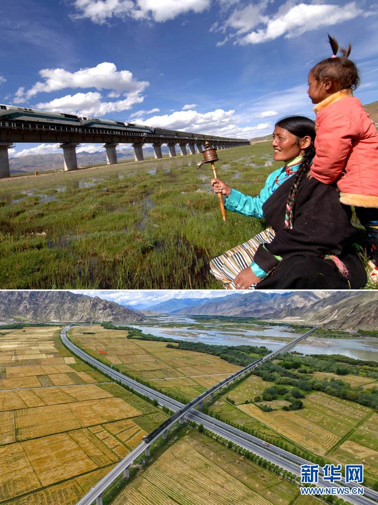 這是一張拼版照片:上圖為西藏當(dāng)雄縣藏族群眾在觀看火車駛過(guò)(2006年6月17日 新華社記者覺(jué)果攝);下圖為在西藏拉薩市曲水縣拍攝的公路與鐵路(2016年8月17日新華社記者普布扎西攝 無(wú)人機(jī)照片),西藏已形成了公路、鐵路、航空的立體交通網(wǎng)絡(luò)。新華社發(fā)