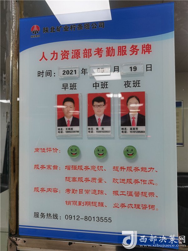 西部決策網(wǎng)訊 在黨史學習教育活動中,開展“我為群眾辦實事”實踐活動是公司黨史學習教育實施方案中的一項重點任務。為及時了解和掌握員工考勤動態(tài),妥善處理和解決好員工考勤中的難點問題,增強員工獲得感、幸福感、安全感,陜北礦業(yè)檸條塔公司人力資源部結合實際,把學黨史與為員工辦實事相結合,增設一面“考勤服務牌”。