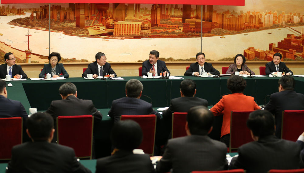 ↑2015年3月5日,習(xí)近平參加十二屆全國(guó)人大三次會(huì)議上海代表團(tuán)的審議。