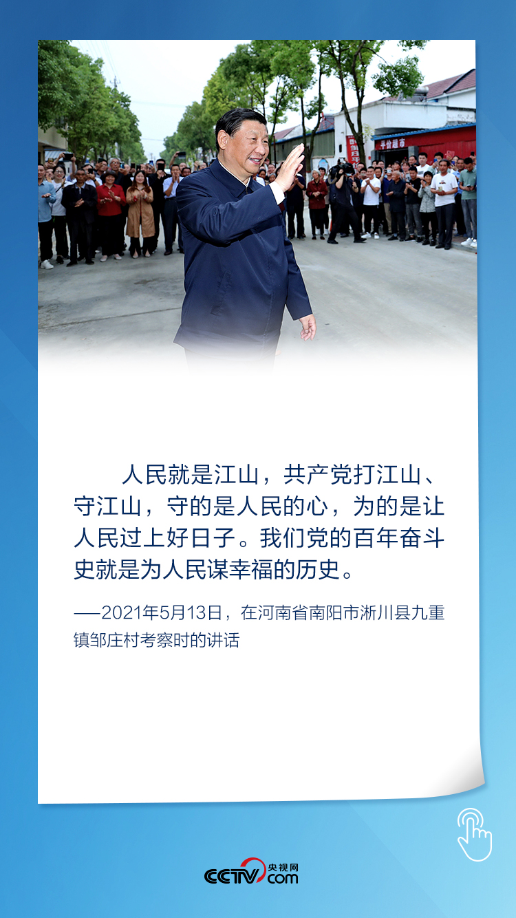 5月南陽之行,總書記馬不停蹄,了解中醫(yī)藥傳承創(chuàng)新、關(guān)心夏糧生產(chǎn)、考察南水北調(diào)移民村產(chǎn)業(yè)發(fā)展、主持召開推進(jìn)南水北調(diào)后續(xù)工程高質(zhì)量發(fā)展座談會,根本目的是為了讓人民過上更好的日子。“我們黨的百年奮斗史就是為人民謀幸福的歷史”,在建黨百年這個特殊年份,總書記如此高頻次到地方考察,用實(shí)際行動詮釋著黨的初心和使命。