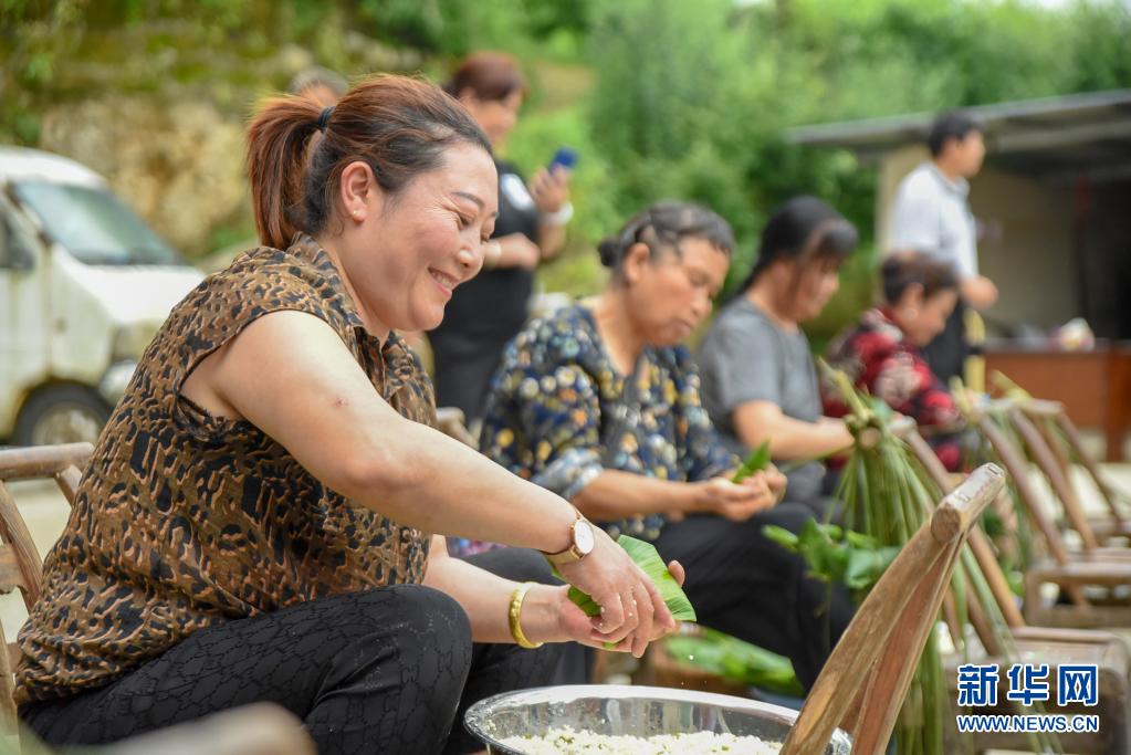 端午節(jié)將至,貴州省銅仁市玉屏侗族自治縣亞魚鄉(xiāng)郭家灣村舉行“我們的節(jié)日,端午”群眾文化活動(dòng),村民們聚在一起比賽包粽子,喜迎端午節(jié)。