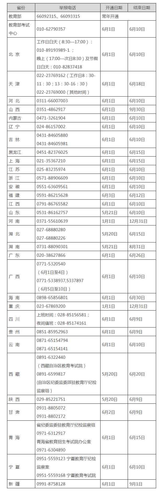 近日,教育部統(tǒng)一公布了教育部以及全國31個?。▍^(qū)、市)教育行政部門和招生考試機構2021年的高考舉報電話,歡迎廣大考生、家長及社會各界人士及時舉報反映涉及2021年高考的問題線索。教育部及各?。▍^(qū)、市)將會同有關部門根據(jù)舉報線索第一時間核查處理,堅決維護高考公平公正。
