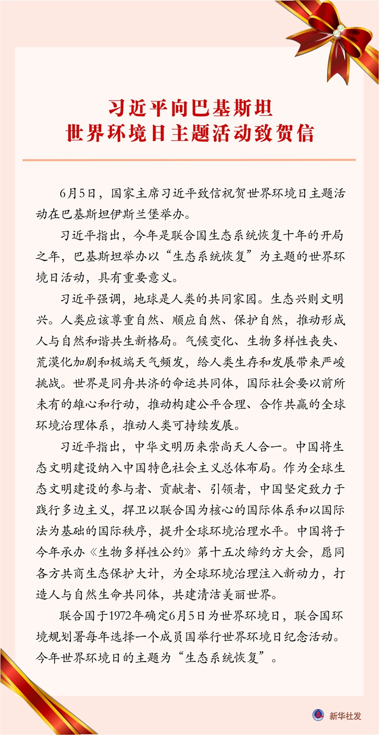 新華社北京6月5日電 6月5日,國家主席習近平致信祝賀世界環(huán)境日主題活動在巴基斯坦伊斯蘭堡舉辦。