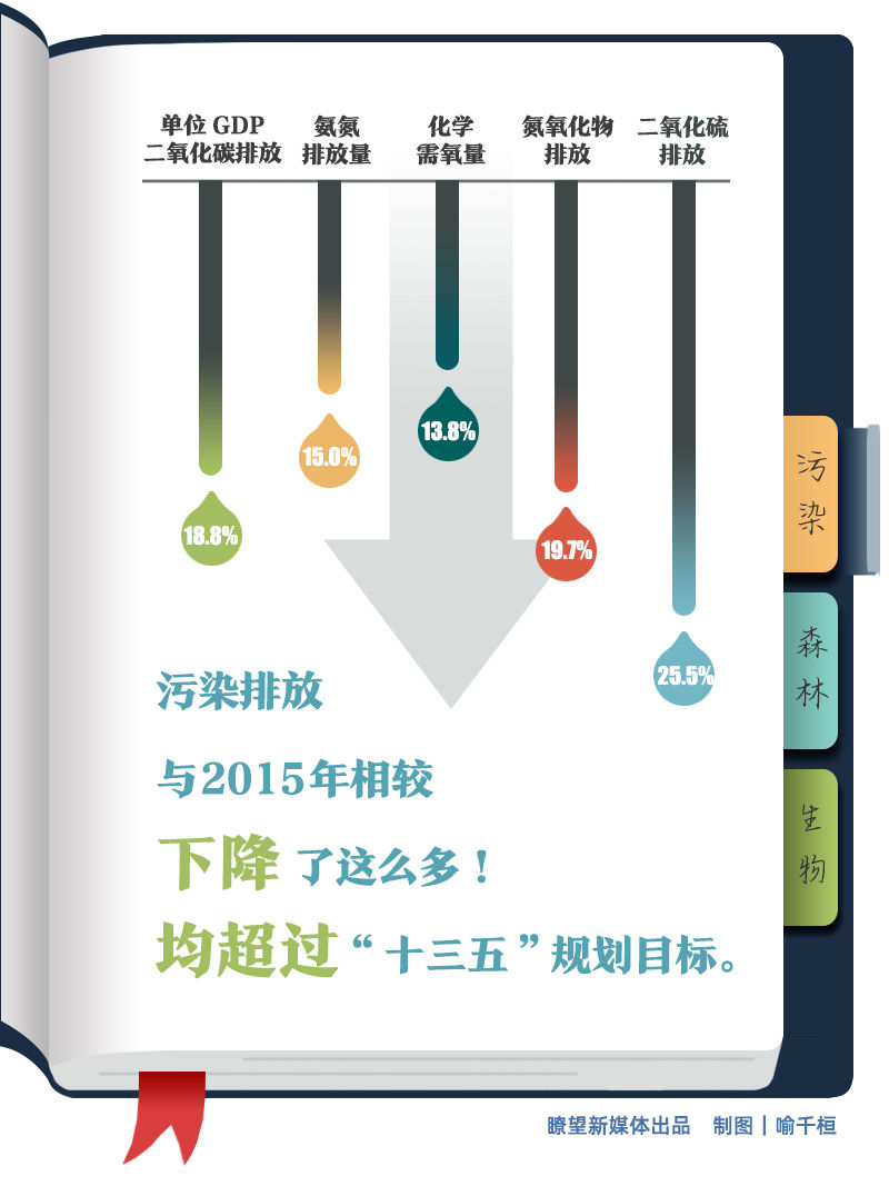 污染更少,減排更有效。二氧化硫、氮氧化物、化學(xué)需氧量、氨氮排放量較2015年分別下降25.5%、19.7%、13.8%、15.0%,單位GDP二氧化碳排放較2015年降低18.8%,均超過(guò)“十三五”規(guī)劃目標(biāo)。