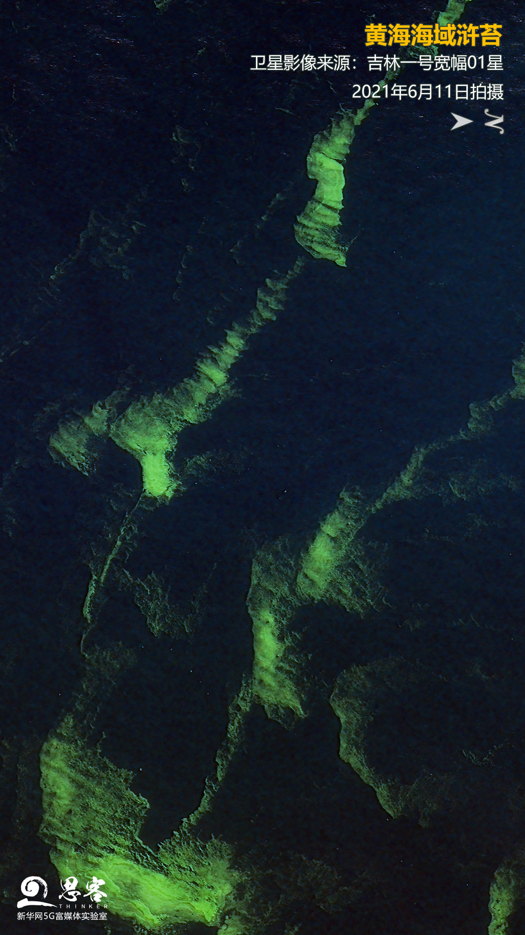 ▲圖為吉林一號寬幅01星2021年6月11日拍攝的黃海海域滸苔。