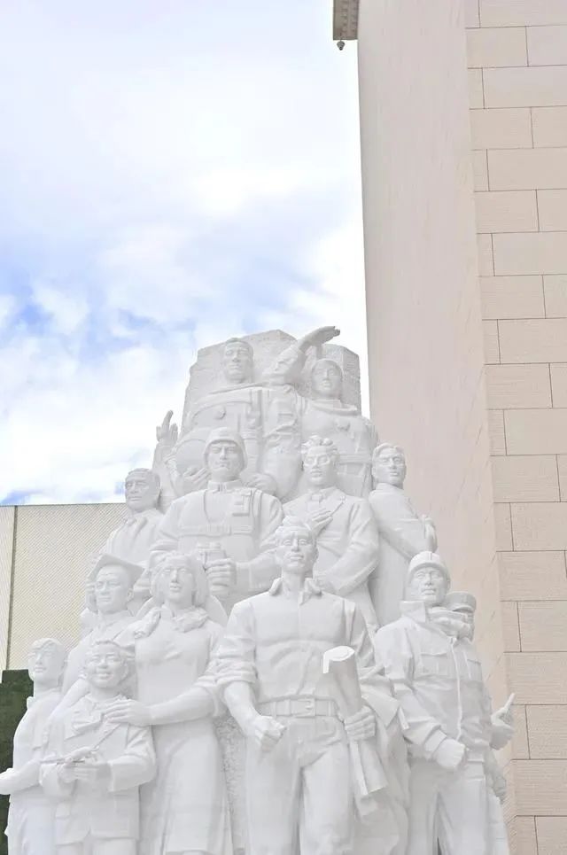 在中國共產(chǎn)黨歷史展覽館廣場上,《信仰》《偉業(yè)》《攻堅》《追夢》四組大型雕塑巍然矗立,氣勢恢宏,分別對應(yīng)“四個偉大”主題,276個人物與583塊漢白玉融為一體。