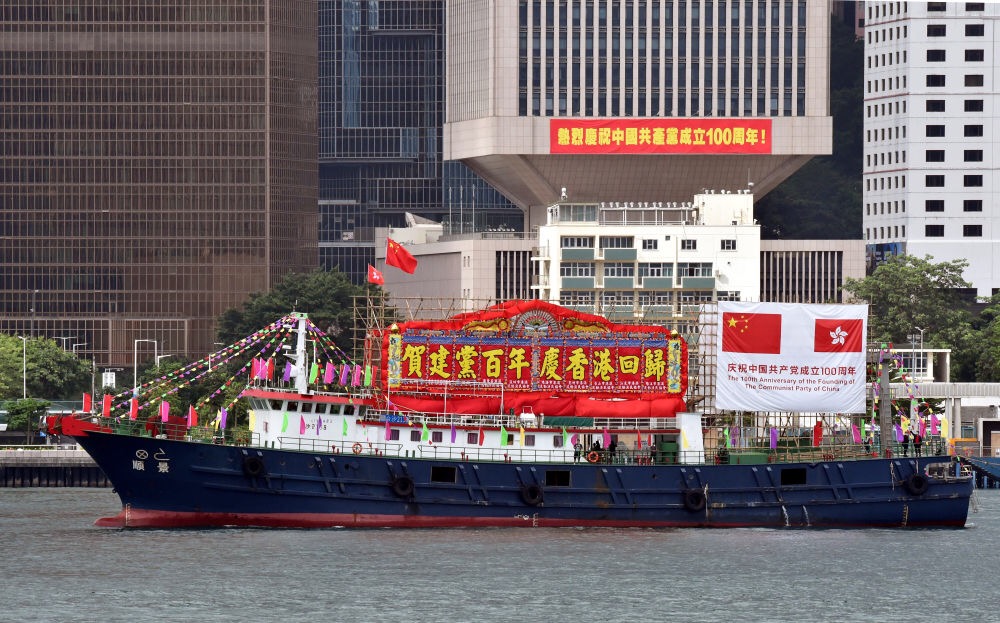 ▲7月1日,懸掛中華人民共和國國旗和香港特別行政區(qū)區(qū)旗的漁船在維多利亞港巡游。