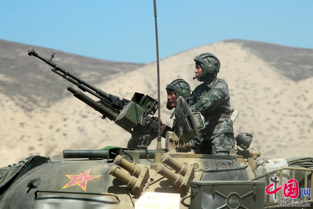 新疆軍區(qū)某合成團坦克二連政治指導員馬和帕麗(右一)組織戰(zhàn)術訓練的情景。袁凱 攝