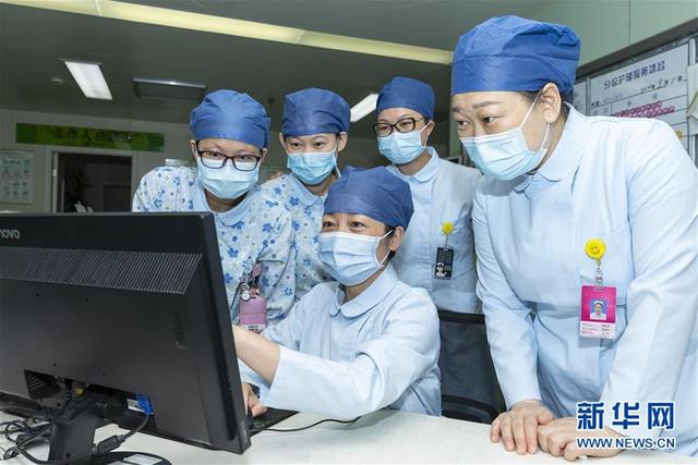 海軍軍醫(yī)大學(xué)第二附屬醫(yī)院急診、重癥醫(yī)學(xué)科護士長陳靜(中)與腎內(nèi)科護士交流病人情況(8月5日攝)。新華社發(fā)(汪輝 攝)