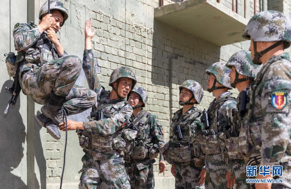 陸軍第76集團(tuán)軍某特戰(zhàn)旅特戰(zhàn)營營長劉近(左二)為戰(zhàn)士講解攀登動(dòng)作要領(lǐng)(7月7日攝)。新華社發(fā)(陳浩 攝)