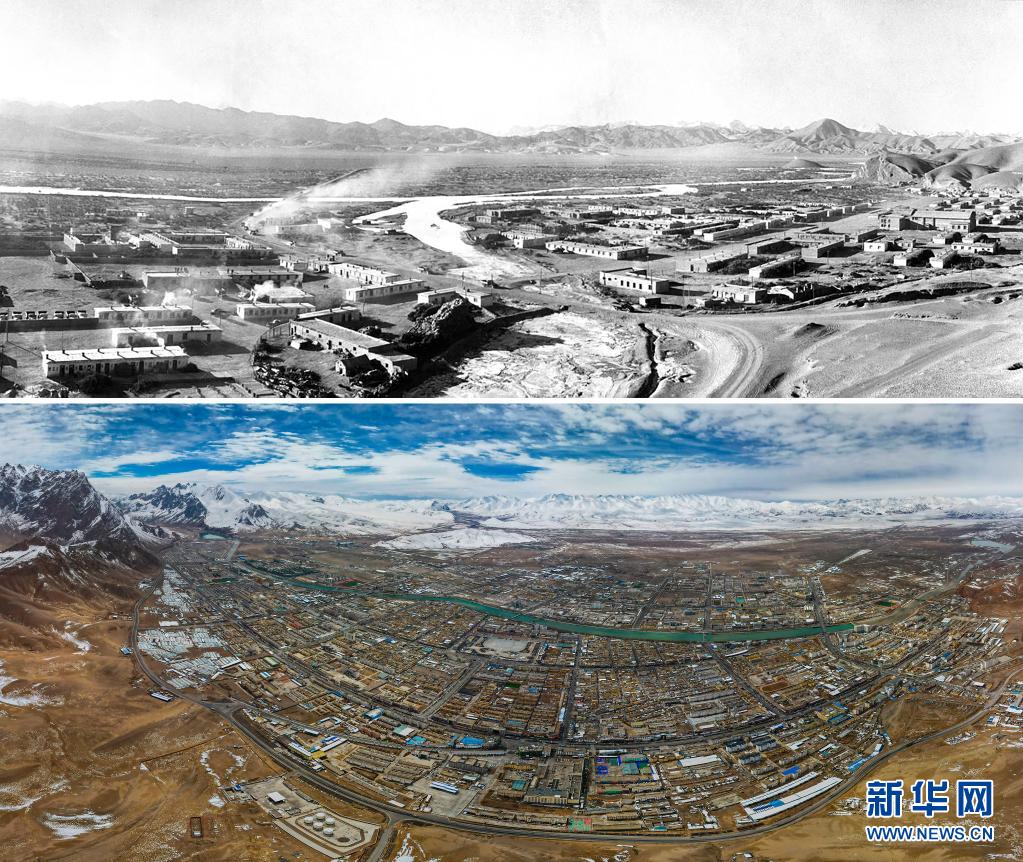 拼版照片:上圖是20世紀(jì)80年代的西藏那曲地區(qū)行署所在地那曲鎮(zhèn)(新華社記者袁克忠攝);下圖是那曲市市區(qū)風(fēng)貌(新華社發(fā) 普布扎西攝,無人機(jī)視頻截圖)。新華社發(fā)