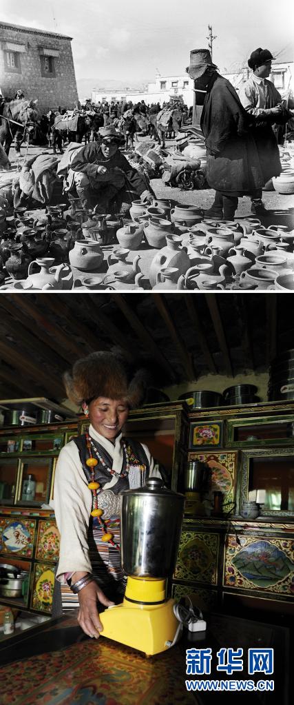 拼版照片:上圖是20世紀(jì)50年代,拉薩居民購(gòu)買酥油茶壺(新華社記者任用昭攝);下圖是2011年12月12日,西藏日喀則拉孜縣吉角村村民倉(cāng)決用電動(dòng)酥油茶攪拌機(jī)給家人打酥油茶(新華社記者普布扎西攝)。新華社發(fā)