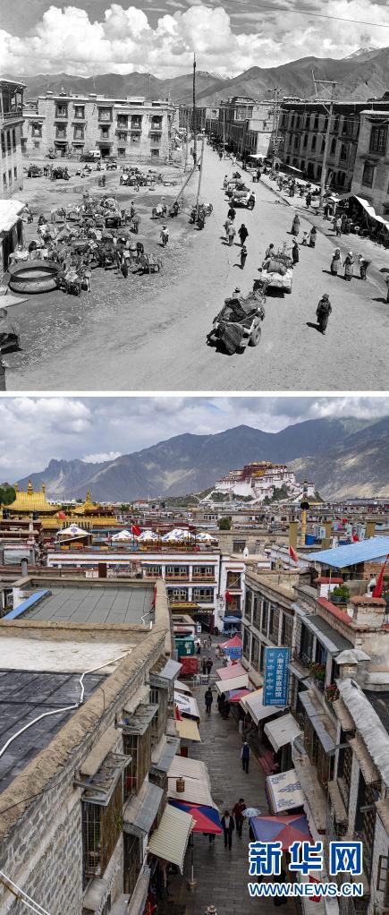 拼版照片:上圖是20世紀(jì)50年代的拉薩市八廓街(新華社記者王純德攝);下圖是2021年8月13日拍攝的拉薩市八廓街(新華社記者覺果攝)。新華社發(fā)