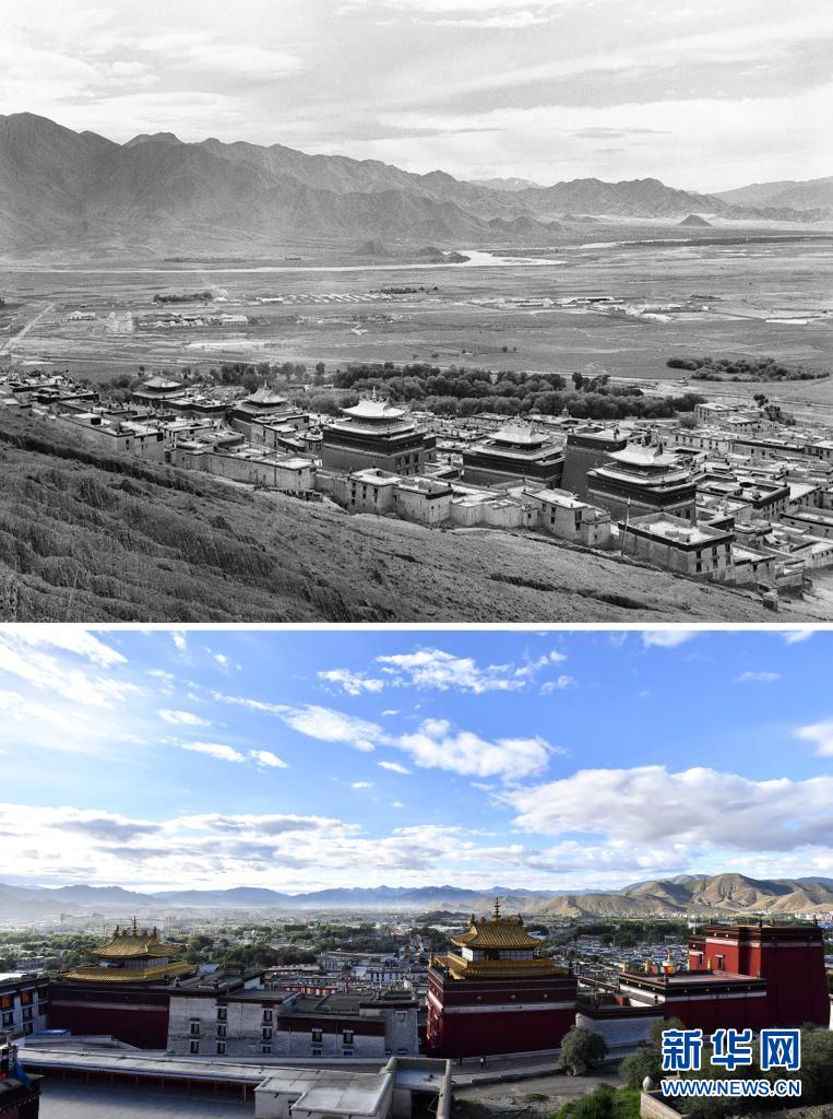 拼版照片:上圖是20世紀(jì)60年代的日喀則(資料照片);下圖是2021年8月9日拍攝的日喀則(新華社記者覺果攝)。新華社發(fā)