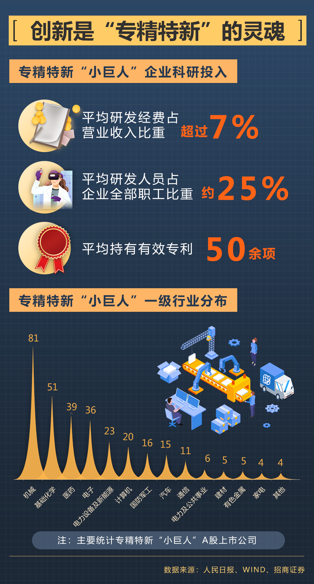 “小巨人”企業(yè)在多個關(guān)鍵領(lǐng)域為龍頭骨干企業(yè)配套,也在細分領(lǐng)域持續(xù)創(chuàng)新并占據(jù)市場領(lǐng)先地位。這些企業(yè)注重制造業(yè)細分領(lǐng)域的創(chuàng)新,在上天、入海、探月、高鐵等大國工程中,都能找到“小巨人”企業(yè)的產(chǎn)品。根據(jù)招商證券統(tǒng)計,A股上市的專精特新“小巨人”企業(yè)中,機械行業(yè)的占比最高,基礎(chǔ)化工、醫(yī)藥、電子等緊隨其后。
