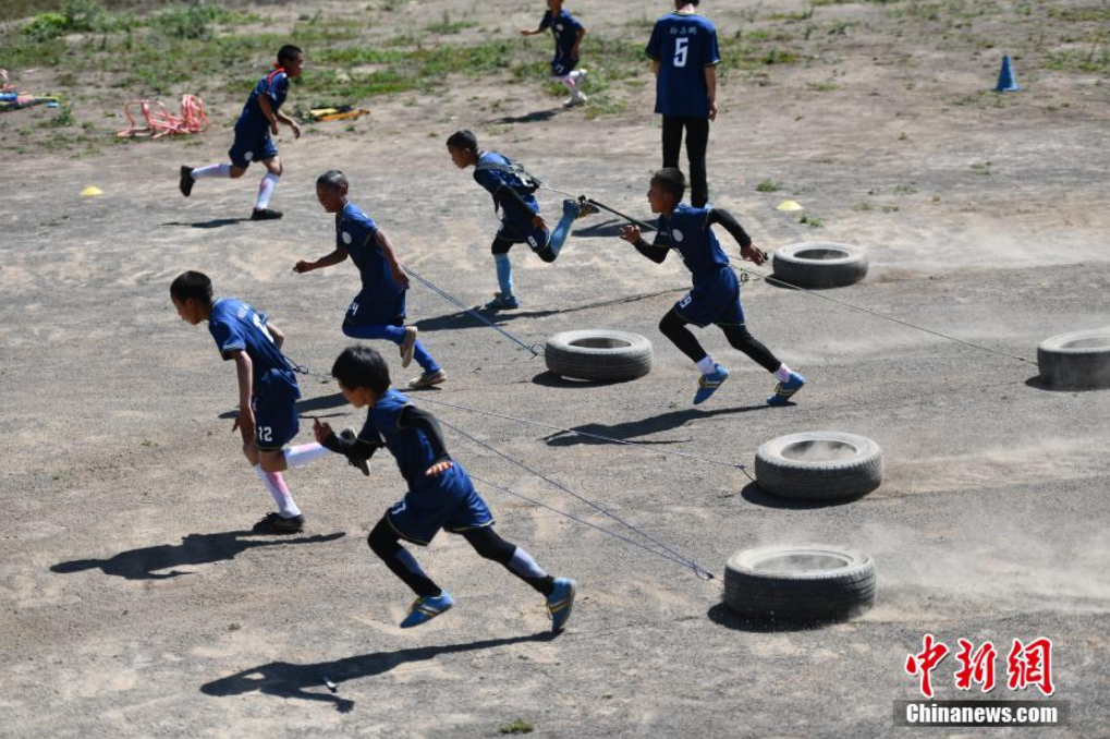 孩子們用廢舊輪胎進行負重訓練。張浪 攝