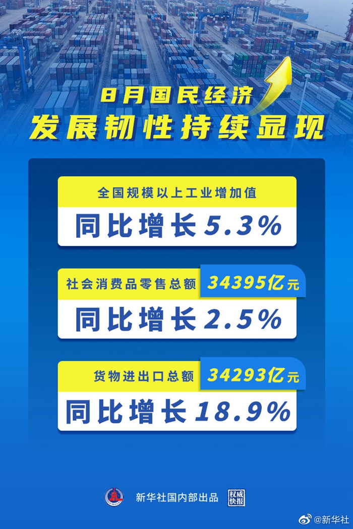 國家統(tǒng)計局15日發(fā)布的數(shù)據(jù)顯示,8月份,全國規(guī)模以上工業(yè)增加值同比增長5.3%,兩年平均增長5.4%;社會消費(fèi)品零售總額34395億元,同比增長2.5%,兩年平均增長1.5%;貨物進(jìn)出口總額34293億元,同比增長18.9%,國民經(jīng)濟(jì)發(fā)展韌性持續(xù)顯現(xiàn)。(記者魏玉坤、謝希瑤)