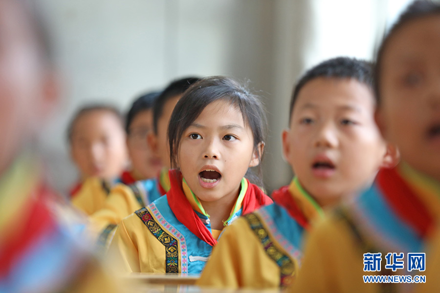 課堂上,彭水自治縣鞍子鎮(zhèn)小學4年級1班孩子們正跟著任茂淑一起傳唱苗族民歌。新華網發(fā)(趙勇 攝)