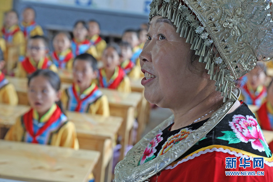 9月28日,“苗族民歌”非物質文化遺產傳承人任茂淑正在課堂上教孩子們傳唱苗族民歌代表作《嬌阿依》。新華網發(fā)(趙勇 攝)