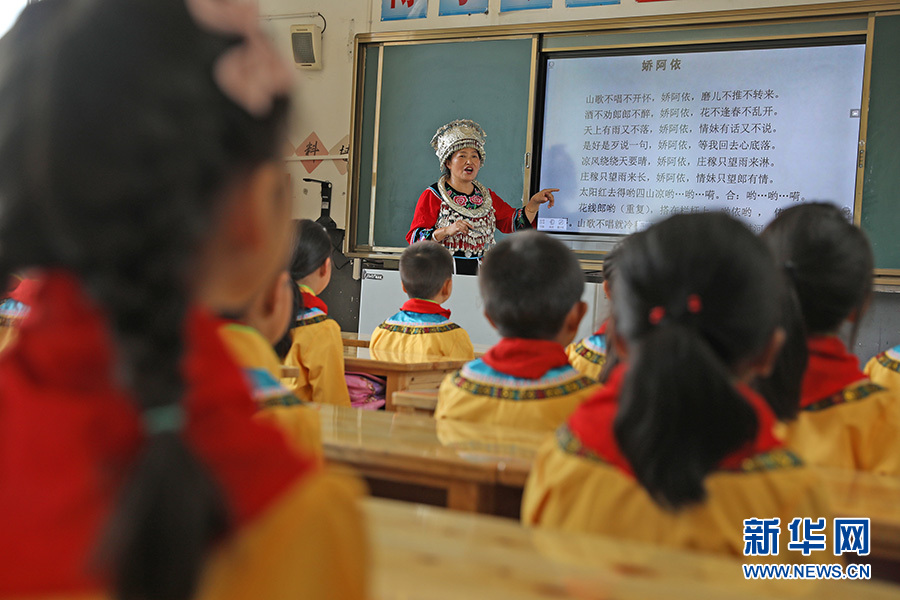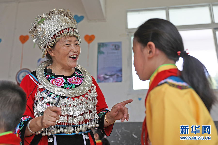 在教室內,任茂淑不僅面對面地教唱,還細心地為孩子們講解民歌的內涵。她說,自己作為一名非遺傳承人,每學期都要到學校為孩子們教唱苗族民歌,通過傳承人走進課堂的方式,讓更多學生了解苗歌、傳唱苗族民歌,更好地保護和傳承這一非物質文遺產。新華網發(fā)(趙勇 攝)