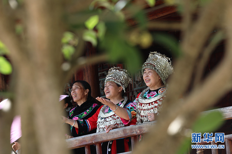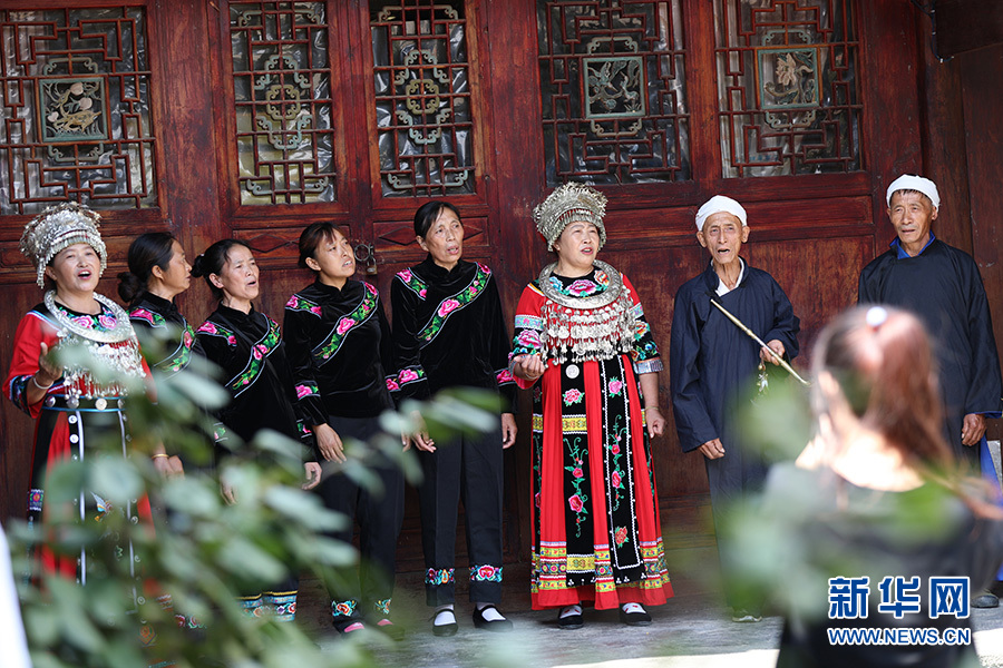 9月28日,在彭水自治縣鞍子鎮(zhèn)羅家坨苗寨,村民們正在綠樹掩映的吊腳樓上演唱苗族民歌。新華網發(fā)(趙勇 攝)