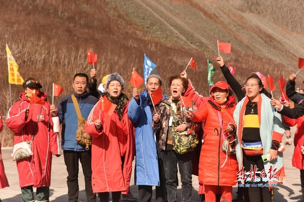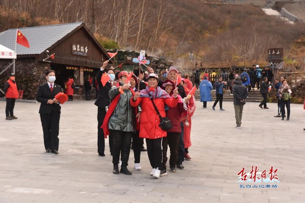在溫泉廣場,幾位游客手持自拍桿,邊跳舞邊拍攝,展現(xiàn)著來長白山游玩的快樂心情。記者偶遇到精神飽滿的游客們手持國旗在廣場上唱響《歌唱祖國》,悠揚的歌聲縈繞在長白山上空......