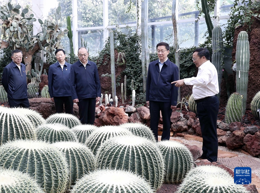 10月11日至12日,中共中央政治局常委、國務(wù)院副總理韓正在云南調(diào)研。這是10月12日,韓正在中國科學(xué)院昆明植物研究所大溫室聽取生物多樣性研究與保護(hù)等工作情況匯報(bào)。新華社記者 劉衛(wèi)兵 攝