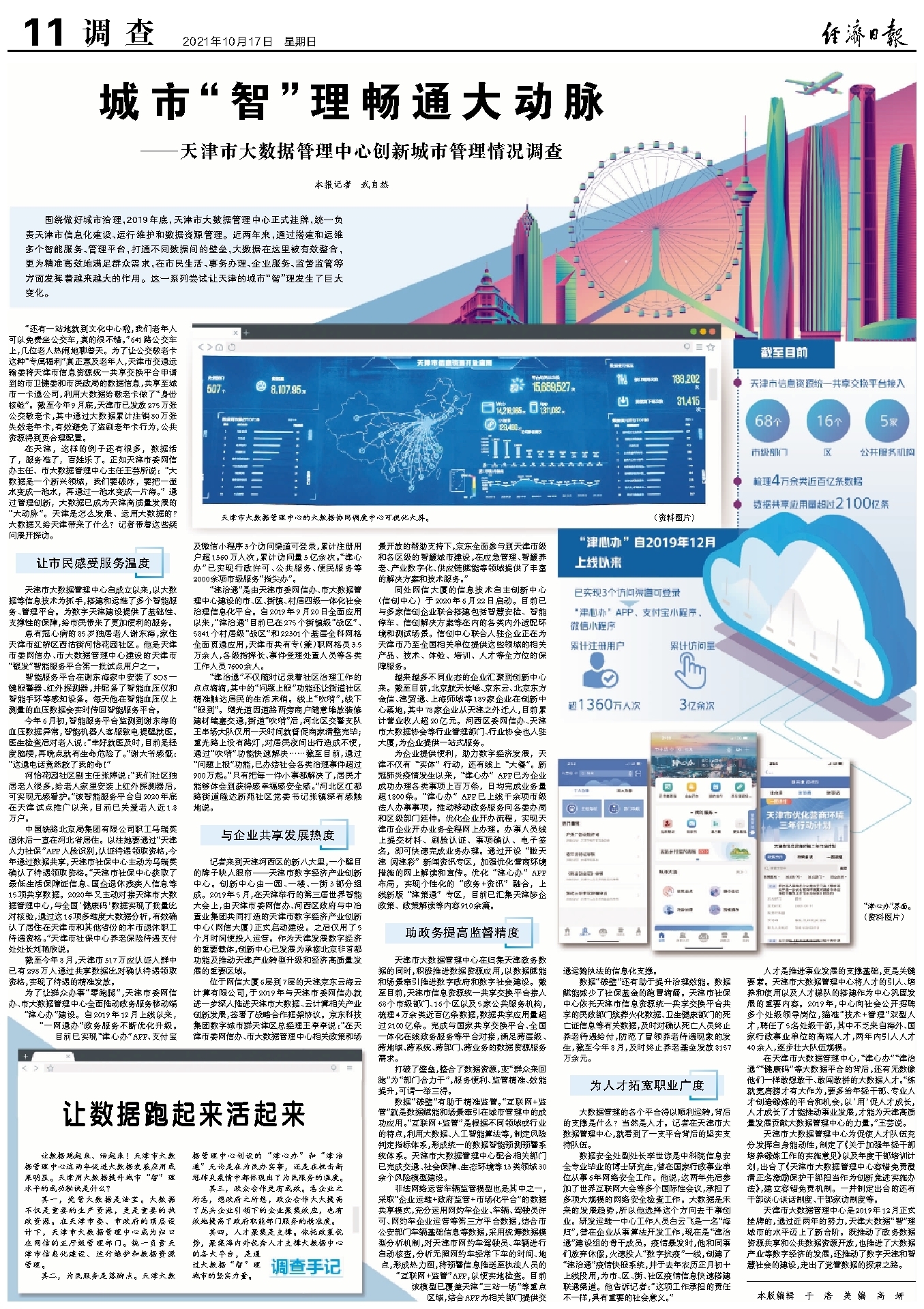 在天津,這樣的例子還有很多,數(shù)據(jù)活了,服務(wù)準(zhǔn)了,百姓樂(lè)了。正如天津市委網(wǎng)信辦主任、市大數(shù)據(jù)管理中心主任王蕓所說(shuō):“大數(shù)據(jù)是一個(gè)新興領(lǐng)域,我們要破冰,要把一壺水變成一池水,再通過(guò)一池水變成一片海。”通過(guò)管理創(chuàng)新,大數(shù)據(jù)已成為天津高質(zhì)量發(fā)展的“大動(dòng)脈”。天津是怎么發(fā)展、運(yùn)用大數(shù)據(jù)的?大數(shù)據(jù)又給天津帶來(lái)了什么?記者帶著這些疑問(wèn)展開探訪。