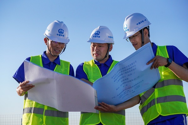 馮兵與同事現(xiàn)場(chǎng)研究圖紙,討論施工方案
