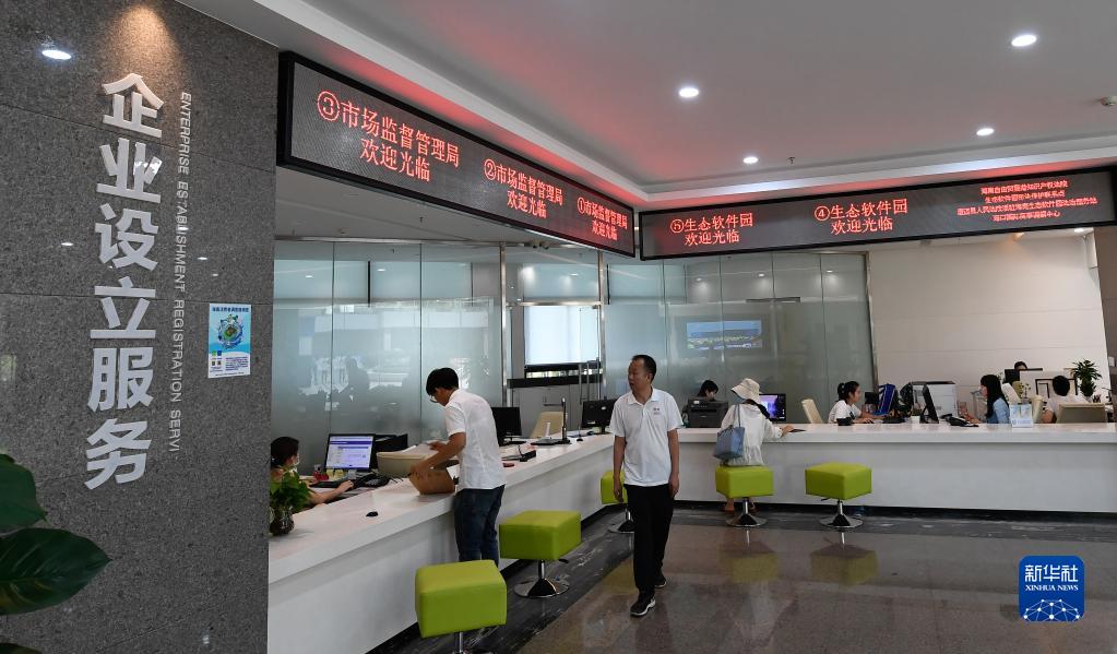 海南自由貿(mào)易港生態(tài)軟件園企業(yè)服務(wù)超市的工作人員為入園企業(yè)提供相關(guān)服務(wù)(5月31日攝)。新華社記者 楊冠宇 攝