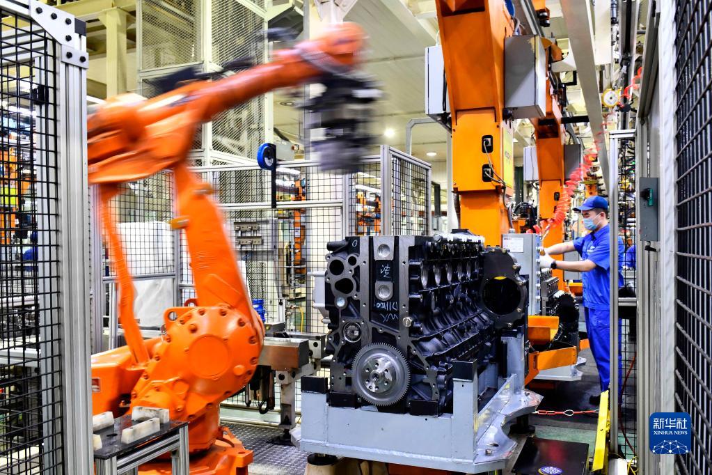 在位于山東濰坊的濰柴集團(tuán)總裝車間,工人在流水線上裝配發(fā)動(dòng)機(jī)(4月22日攝)。新華社記者 郭緒雷 攝
