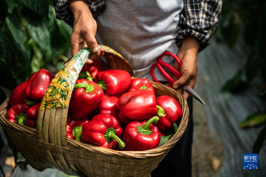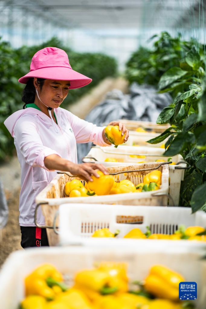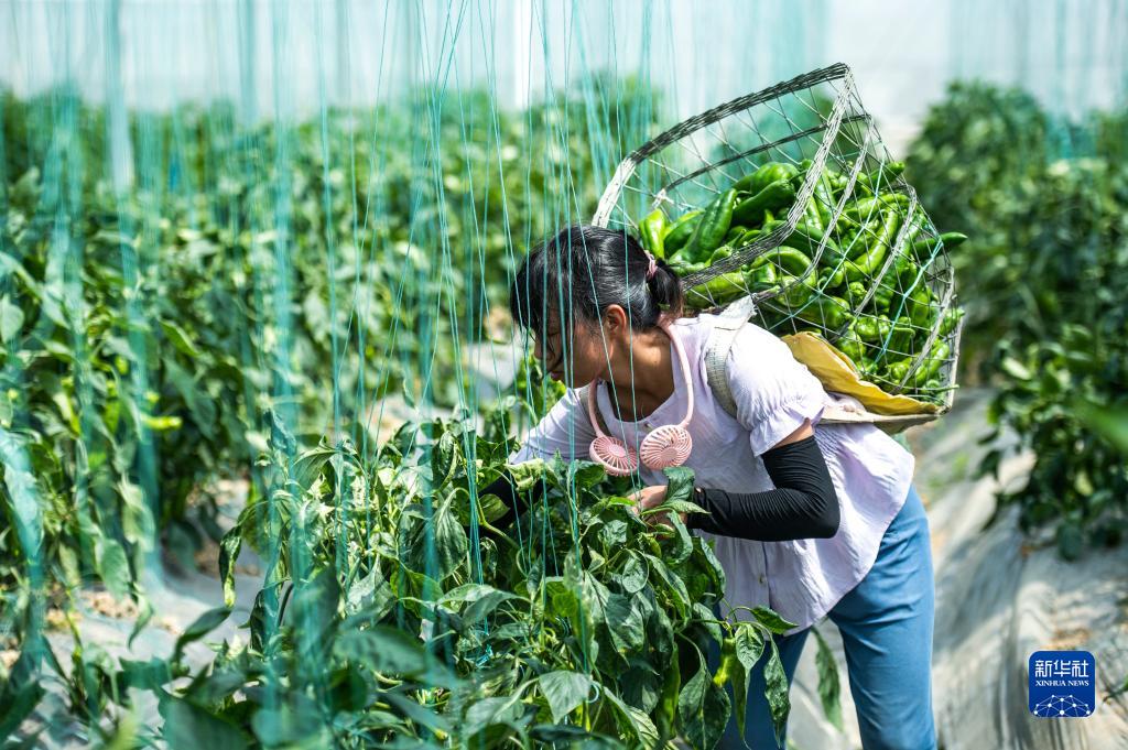 村民在貴陽(yáng)農(nóng)投集團(tuán)奇申蔬菜基地采收牛角椒(7月29日攝)。新華社記者 陶亮 攝