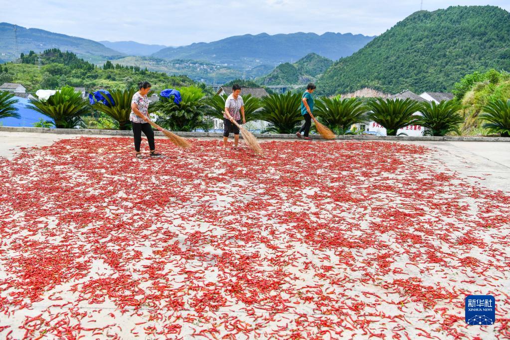 在貴州省思南縣塘頭鎮(zhèn)青杠壩村幸福食品加工廠,村民在晾曬辣椒(2020年8月12日攝)。新華社記者 楊文斌 攝