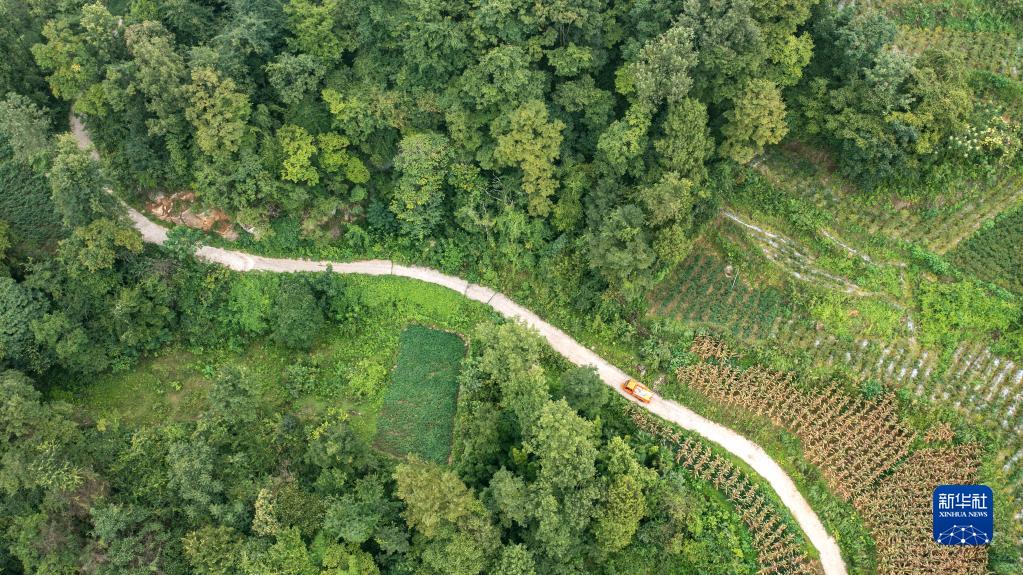 收購(gòu)辣椒的小貨車(chē)行駛在貴州省湄潭縣梭塘村的鄉(xiāng)間小路上(8月29日攝,無(wú)人機(jī)照片)。新華社記者 陶亮 攝