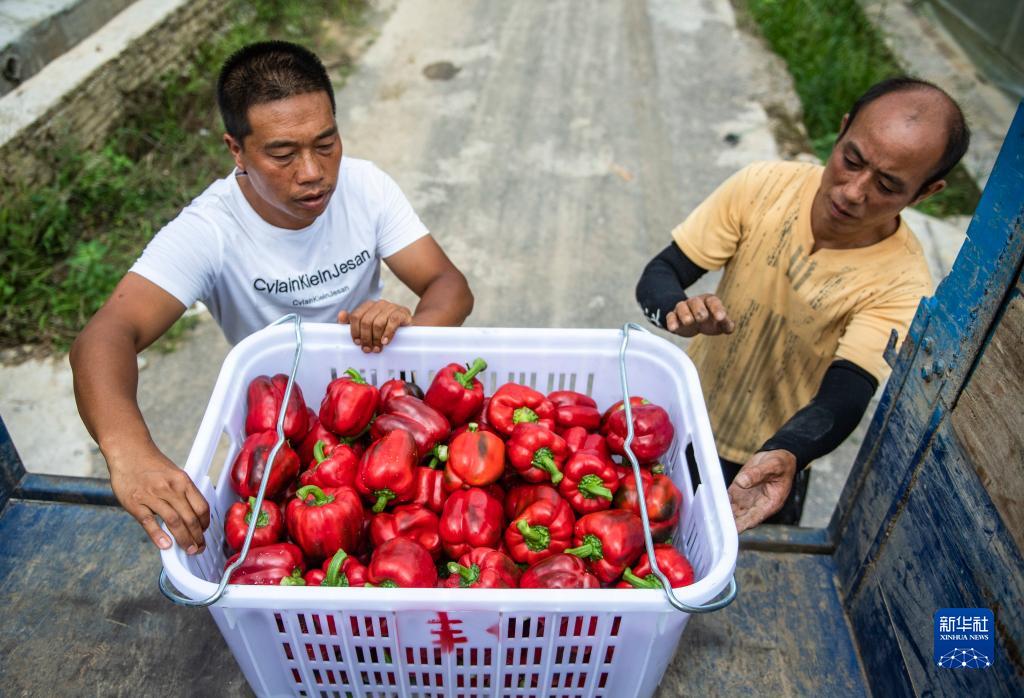 當(dāng)?shù)卮迕裨谫F陽(yáng)農(nóng)投集團(tuán)花溪蔬菜基地將采收好的柿子椒裝車(chē)(7月30日攝)。新華社記者 陶亮 攝