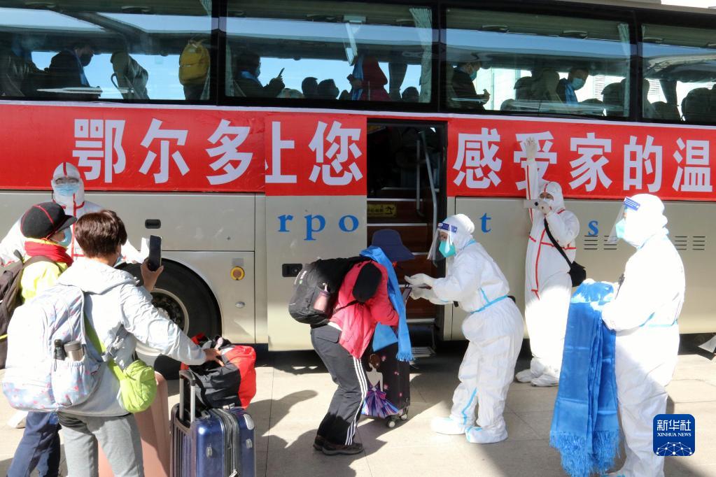 站臺外,一輛輛掛有“人民至上,生命至上”“鄂爾多斯讓您感受家的溫暖”等橫幅標語的大客車旁,寫有“伊金霍洛歡迎您”“康巴什歡迎您”“東勝歡迎您”的標識牌,十分醒目。