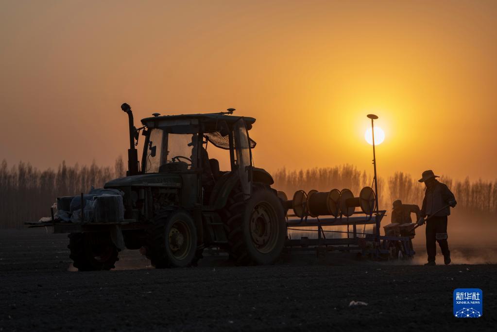 春播時(shí)節(jié),陸德文駕駛采棉機(jī)在棉田播種,兩名工人在車(chē)后跟隨保障,隨時(shí)進(jìn)行壓地膜、補(bǔ)充棉種和處理故障等作業(yè)(4月14日攝)。新華社記者 胡虎虎 攝