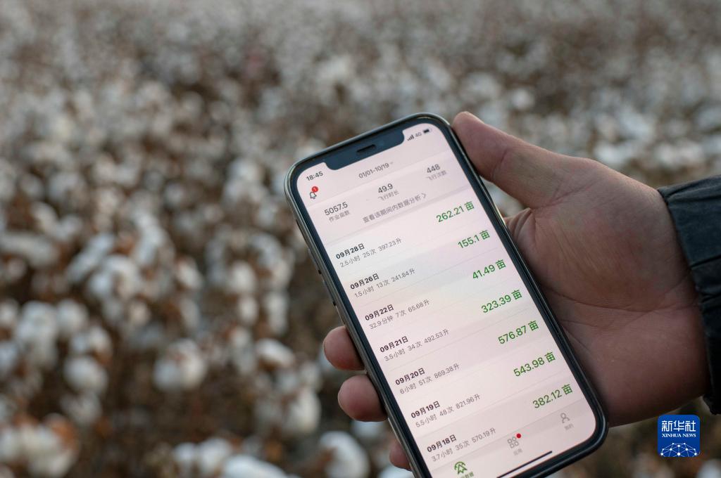 秋收時(shí)節(jié),陸德文展示自己使用無(wú)人機(jī)為自家和其他農(nóng)戶(hù)棉田打落葉劑的飛行數(shù)據(jù)(10月19日攝)。在親身感受過(guò)無(wú)人機(jī)飛防作業(yè)的便捷后,老陸家在今年8月買(mǎi)了一臺(tái)。新華社記者 胡虎虎 攝