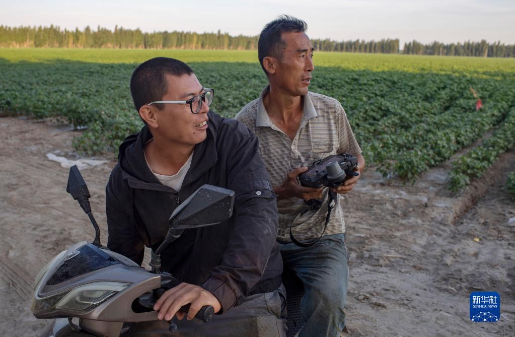 盛夏田間管理期間,陸高林的兒子陸德文(左)騎摩托車(chē)帶著農(nóng)業(yè)植保無(wú)人機(jī)操作手圍著棉地規(guī)劃飛防作業(yè)路線(xiàn)(7月15日攝)。新華社記者 胡虎虎 攝