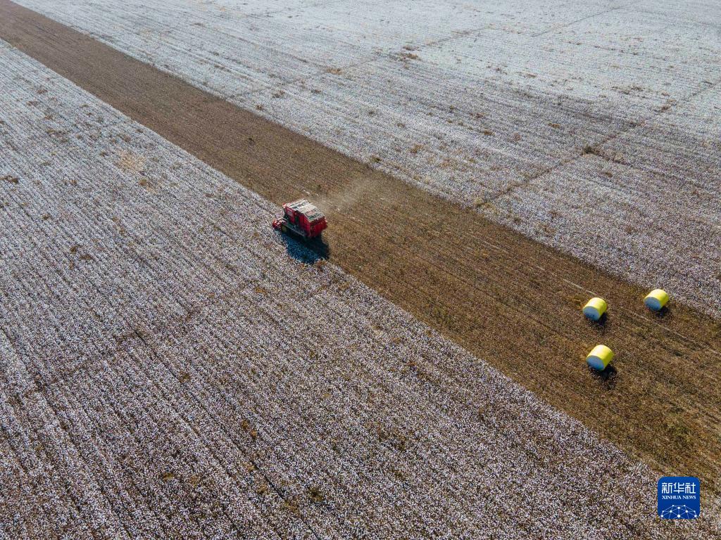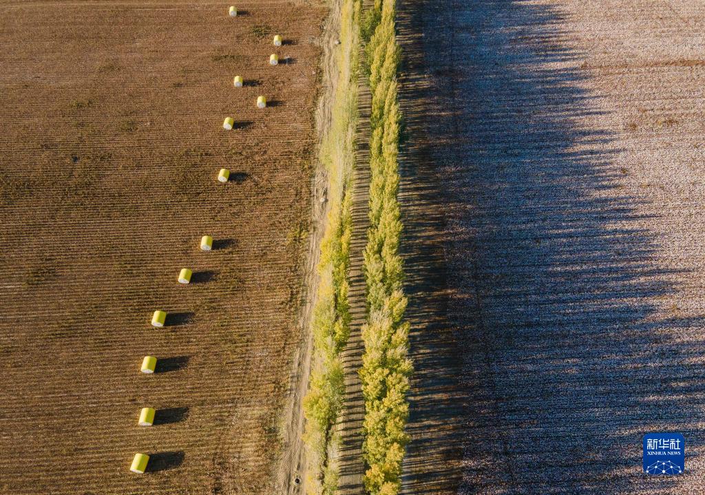 這是在新疆塔城地區(qū)沙灣市大泉鄉(xiāng)三道溝村拍攝的陸高林家的棉田(10月24日攝,無(wú)人機(jī)照片)。畫(huà)面左側(cè)為已采收的棉田,棉包擺放在地上,待價(jià)格合適時(shí),這些棉包將被運(yùn)往軋花廠售賣(mài);右側(cè)為待采收的地塊。新華社記者 胡虎虎 攝