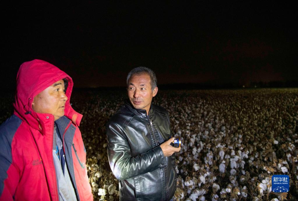 在新疆塔城地區(qū)沙灣市大泉鄉(xiāng)三道溝村,夜幕降臨后,陸高林(右)在等待采棉機(jī)轉(zhuǎn)場(chǎng),并與采棉機(jī)老板商量棉花采收進(jìn)展(10月22日攝)。新華社記者 胡虎虎 攝