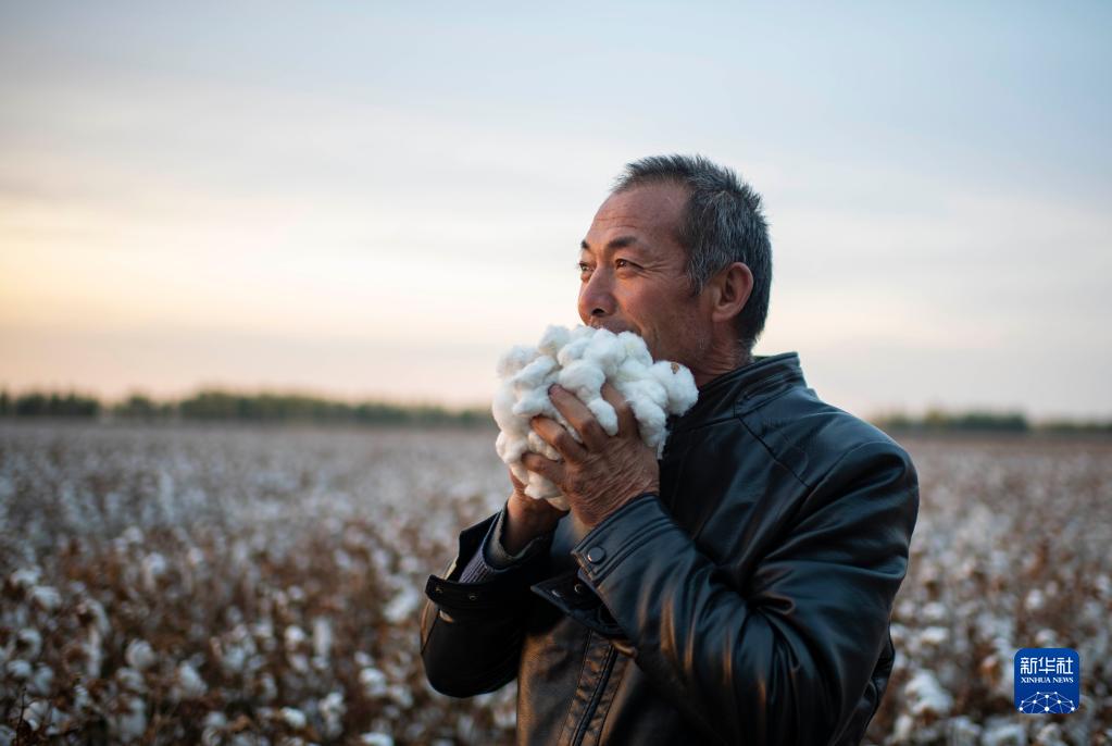 雨過(guò)天晴,因擔(dān)心棉花過(guò)濕而影響采收進(jìn)度,陸高林急忙來(lái)到棉田摘了一朵棉花,放進(jìn)嘴里咬破棉籽,看棉花被雨水淋濕的程度(10月23日攝)。新華社記者 胡虎虎 攝