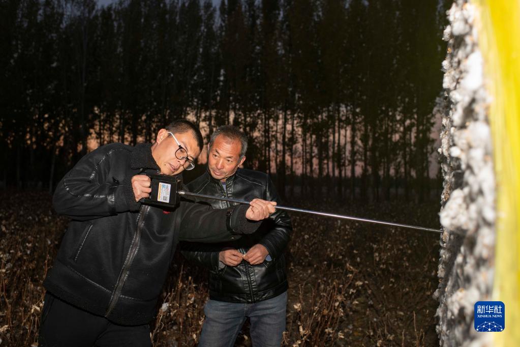 在新疆塔城地區(qū)沙灣市大泉鄉(xiāng)三道溝村,陸高林(右)和兒子陸德文使用儀器檢測(cè)已采收棉花的濕度(10月23日攝)。棉花售賣(mài)時(shí),軋花廠會(huì)對(duì)棉包進(jìn)行質(zhì)量抽測(cè),濕度過(guò)高會(huì)影響價(jià)格。新華社記者 胡虎虎 攝