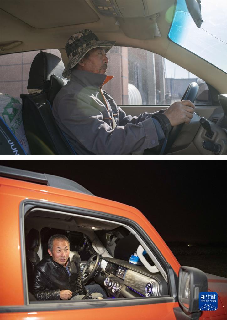 拼版照片:上圖為春播時(shí)節(jié),陸高林開(kāi)車(chē)載著農(nóng)資去棉田干活(4月15日攝);下圖為秋收時(shí)節(jié),陸高林在新?lián)Q的越野車(chē)內(nèi)等候采棉機(jī)轉(zhuǎn)場(chǎng)(10月22日攝)。新華社記者 胡虎虎 攝