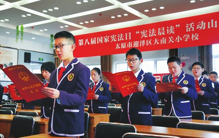 12月3日,迎澤區(qū)大南關(guān)小學(xué)開展“憲法晨讀”活動(dòng)。該校作為第八屆國(guó)家憲法日“憲法晨讀”山西分會(huì)場(chǎng),通過(guò)讓學(xué)生們朗讀憲法、收看直播等方式宣傳憲法知識(shí)。(徐浩軒 攝)