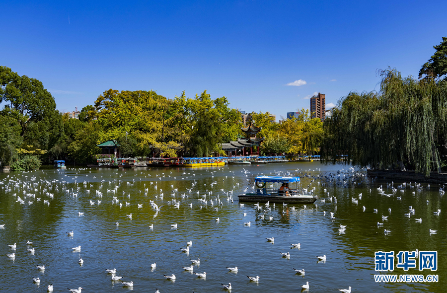 在翠湖公園越冬的紅嘴鷗(11月21日攝)。新華網(wǎng)發(fā)(鄭益 攝)