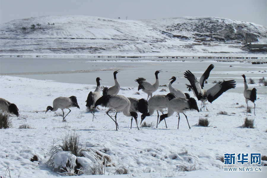黑頸鶴在白雪中翩翩起舞(11月25日攝)。新華網(wǎng)發(fā)(鄭遠(yuǎn)見 攝)