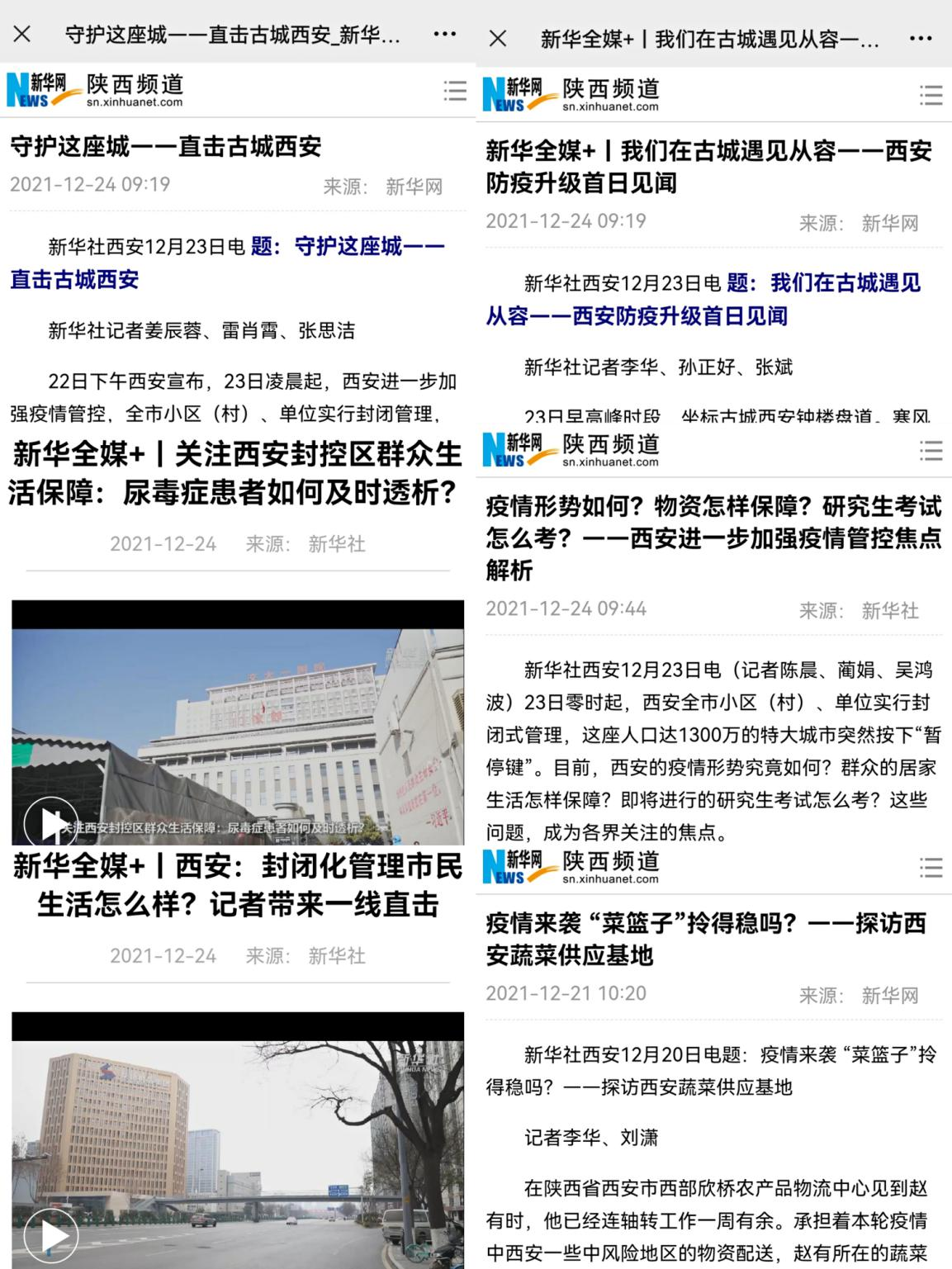 從關(guān)注尿毒癥患者如何及時(shí)透析到封閉化管理市民生活怎樣,從西安防疫升級(jí)首日見聞到記者答疑確診病例為何增長(zhǎng)迅速,從新一輪核酸檢測(cè)現(xiàn)場(chǎng)到蔬菜保供打消市民恐慌……新華社記者每天從城市的各個(gè)角落發(fā)回第一手消息,用他們的筆觸、鏡頭向廣大網(wǎng)民展現(xiàn)西安城的堅(jiān)守和溫暖,最大程度還原這座城市疫情防控過程中每一個(gè)環(huán)節(jié)的進(jìn)展與成效。